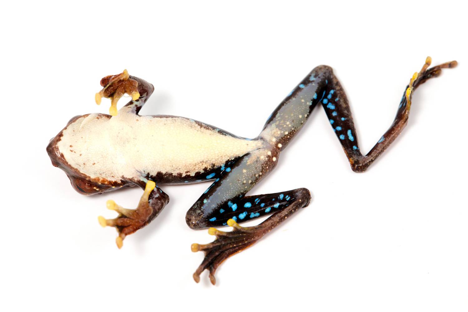 Usually there are white spots below the eye on the upper lip. However, some populations lack that feature. Blue spots are present in the region of the groin and on the backside of the thigh, often on the ventral side of the thigh, parts of the belly and the dorsal side of the inner toes too. The coloration of the upper side is mostly in shades of brown, sometimes the back can exhibit green. Darker markings are present. The hindlimbs are baded. Throat, chest and belly are white.