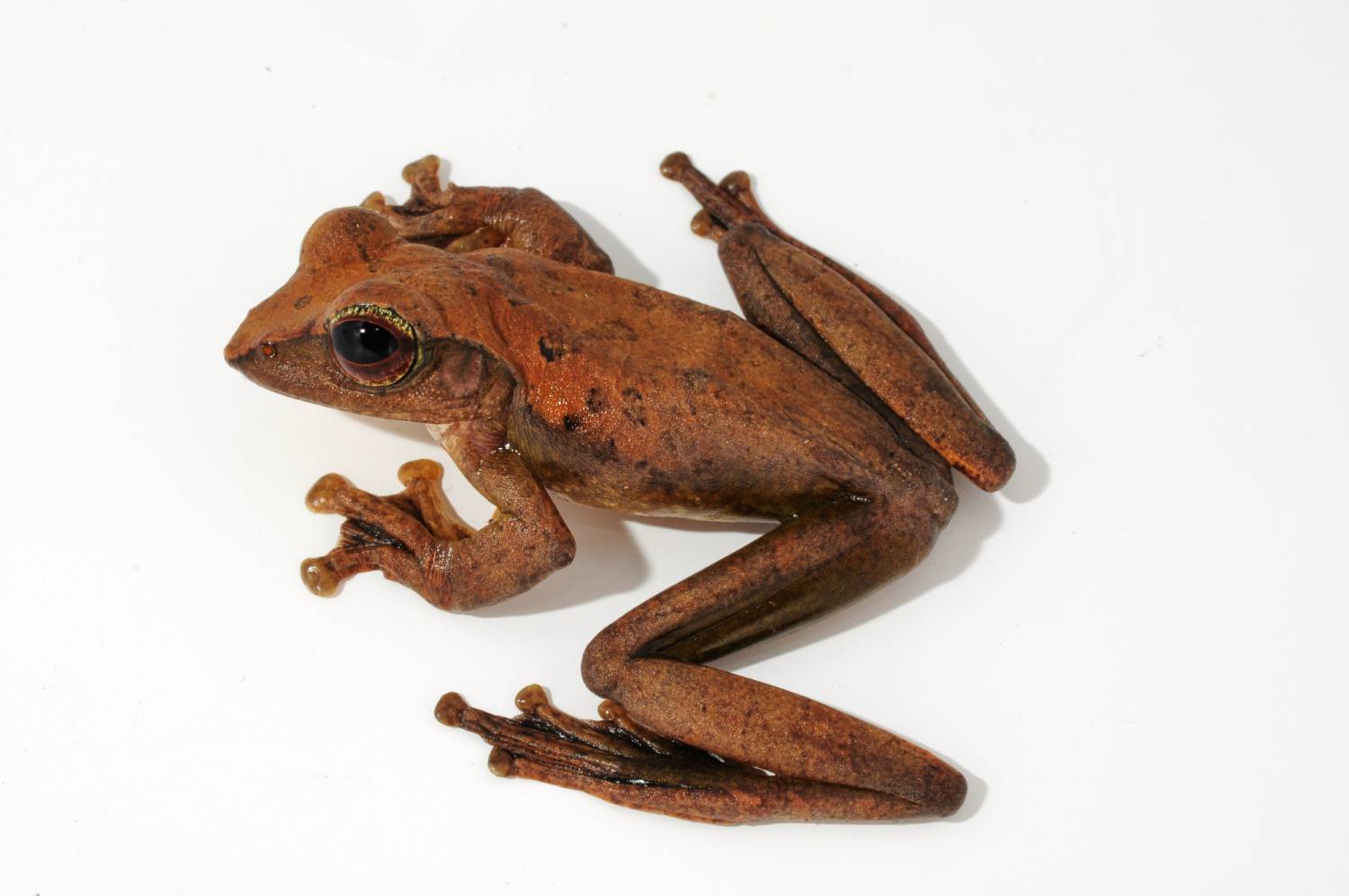 This species is generally brown and rather plain in appearance, though it can often show reddish tones on the back. The hands are notable for their fully developed dark webbing, with the three outer fingers webbed all the way to the adhesive discs. The tips of all fingers and toes expand into large discs. The snout is relatively long, angular, sharply edged, and pointed. White or cream colored spots can be present or absent on the upper lip under the eye. The skin lacks large tubercles or warts and is mostly finely granular. The iris is reddish around the pupil, transitioning to gray toward the outer edge.