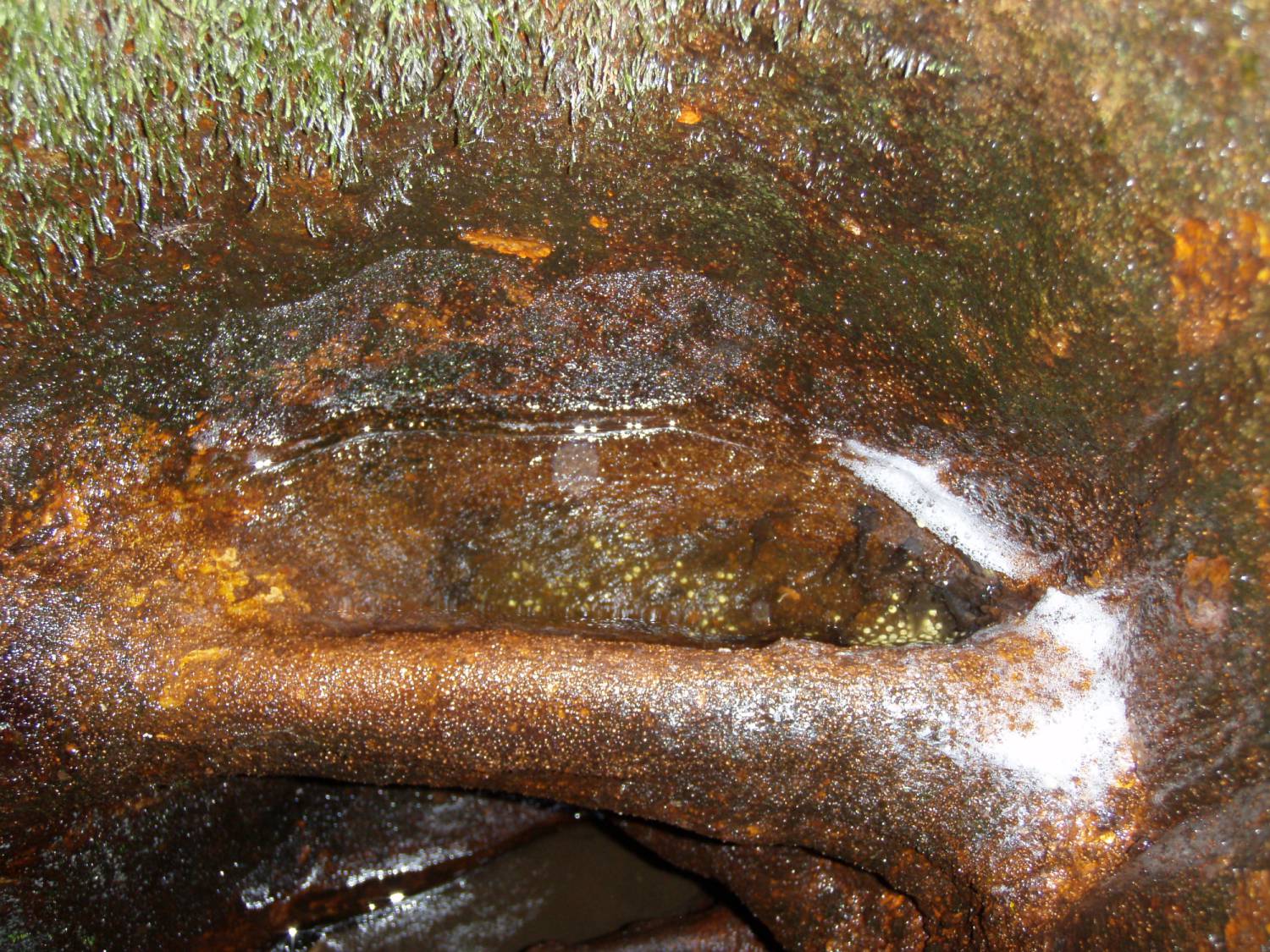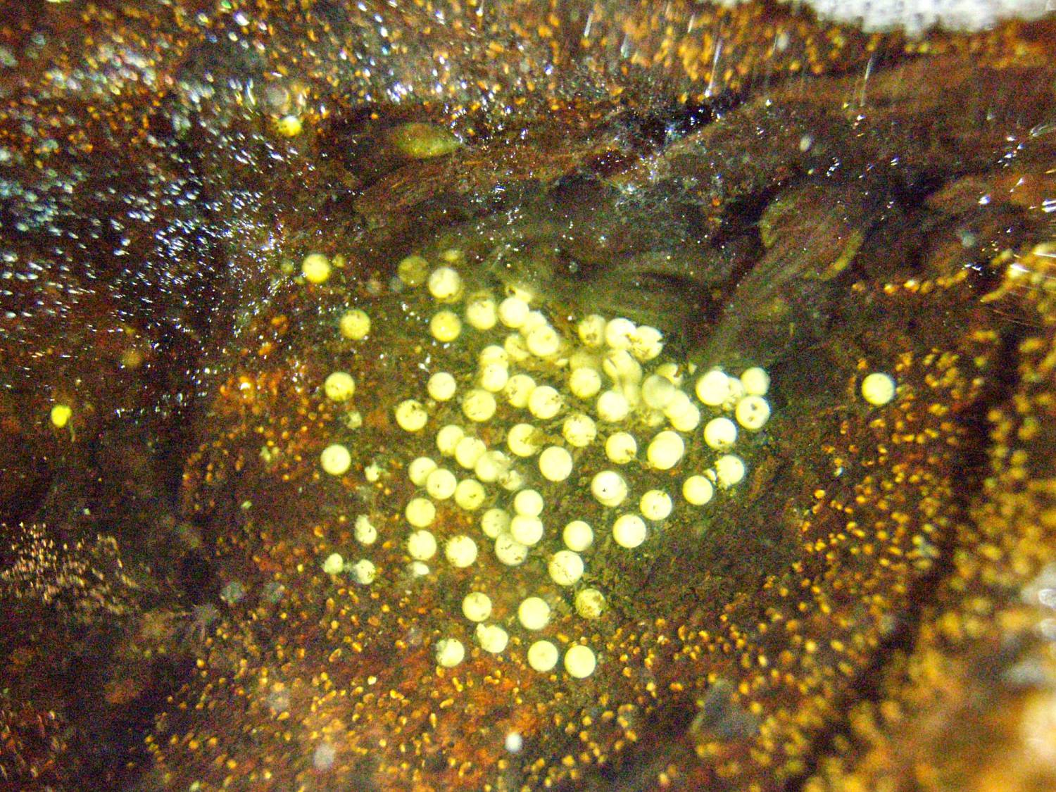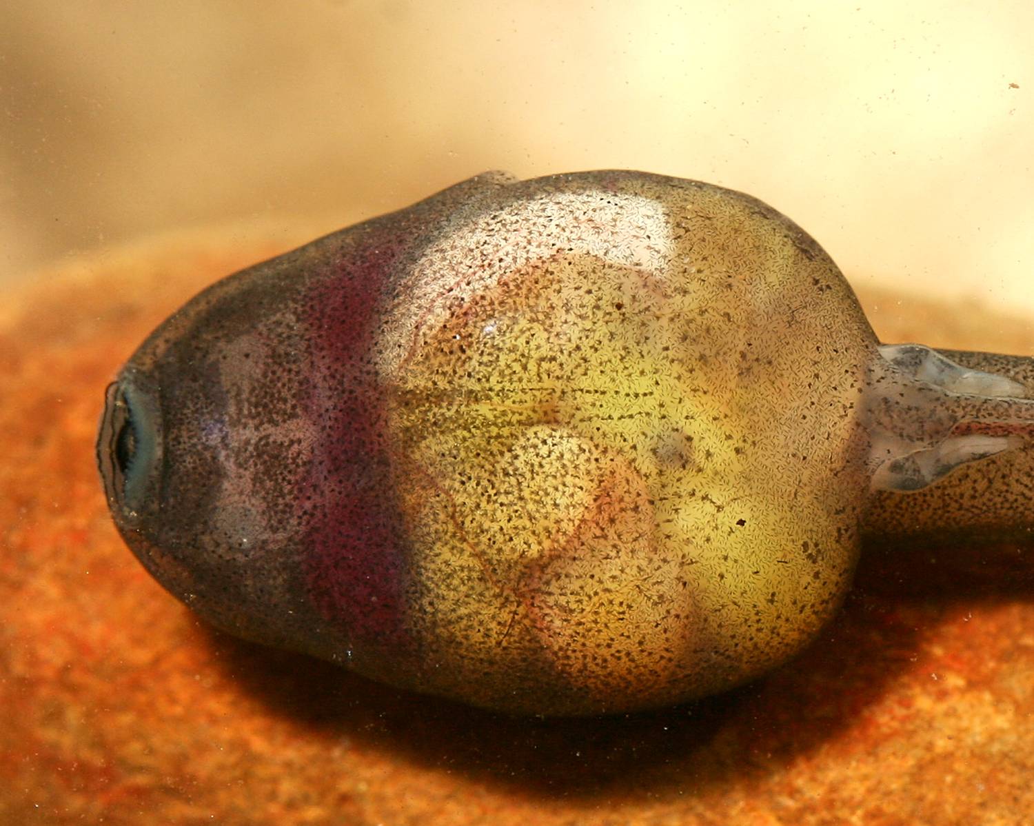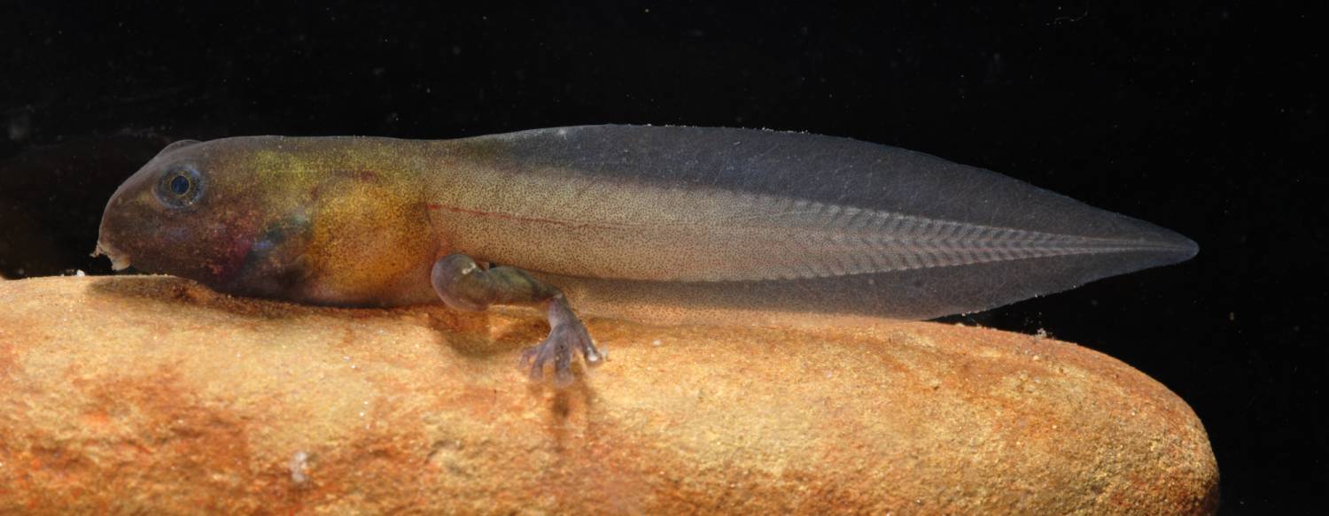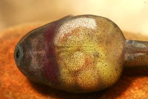 The tadpoles of L. harrissoni are relatively large, exceeding 40 mm in total length. The tail fin is well developed and extends to the junction of the trunk and tail, with a moderately pointed tip. The body is broadly ovoid and the snout is short. Tadpoles are very dark, appearing almost black in the field, although flash photography makes them appear lighter.