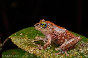 This frog ranges from 24 mm (males) to 35 mm (females). The body shape is relatively stocky with rounded to pointed snout. The legs are only moderately long. Toes and fingers bear terminal adhesive disks. Toes webbed to about one third, fingers without webbing. The dorsal skin bears tubercles and some ridges.