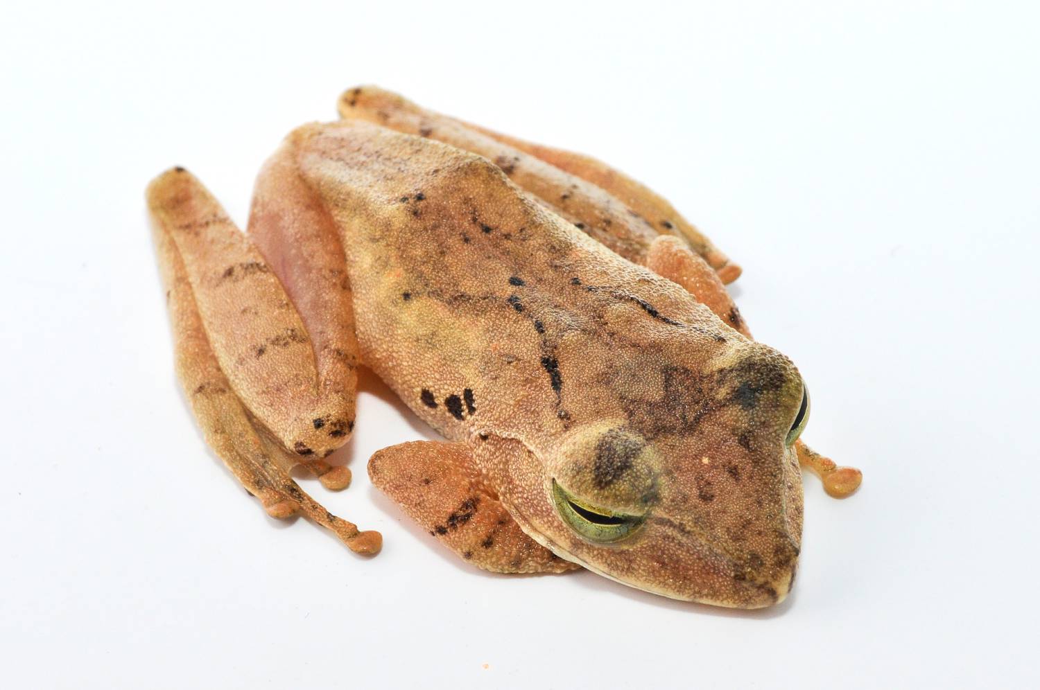 It is a medium-sized species: males reach up to 49 mm and females up to 63 mm in snout–vent length (SVL). The snout is relatively long and sharply pointed. Fingers and toes end in large adhesive discs; the toes are almost fully webbed, whereas the fingers have only rudimentary webbing. The dorsal skin is finely granular or pebbled, and some slightly enlarged tubercles may be present on top of the eyes and along both sides in a line across the upper shoulder region, forming an open V. The eardrum (tympanum) is visible, though indistinct from the surrounding skin. A curved supratympanic fold runs from the eye to the arm. The heels lack calcar spurs.