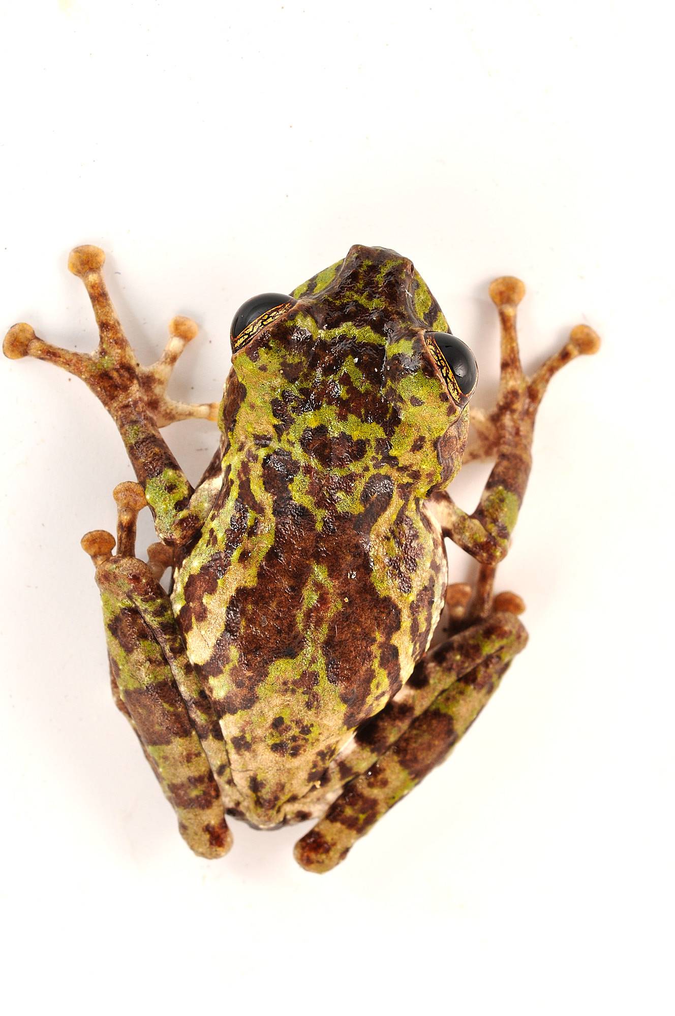 Dorsal coloration is typically green with extensive brown markings, sometimes forming an X on the dorsum. The lower flanks are white with dark brown markings that often form a striped pattern. In some individuals, the groin and armpit regions are tinged with reddish hues. The iris has a bronze background with a conspicuous dark reticulation, and the pupil is bordered by a thin orange ring.