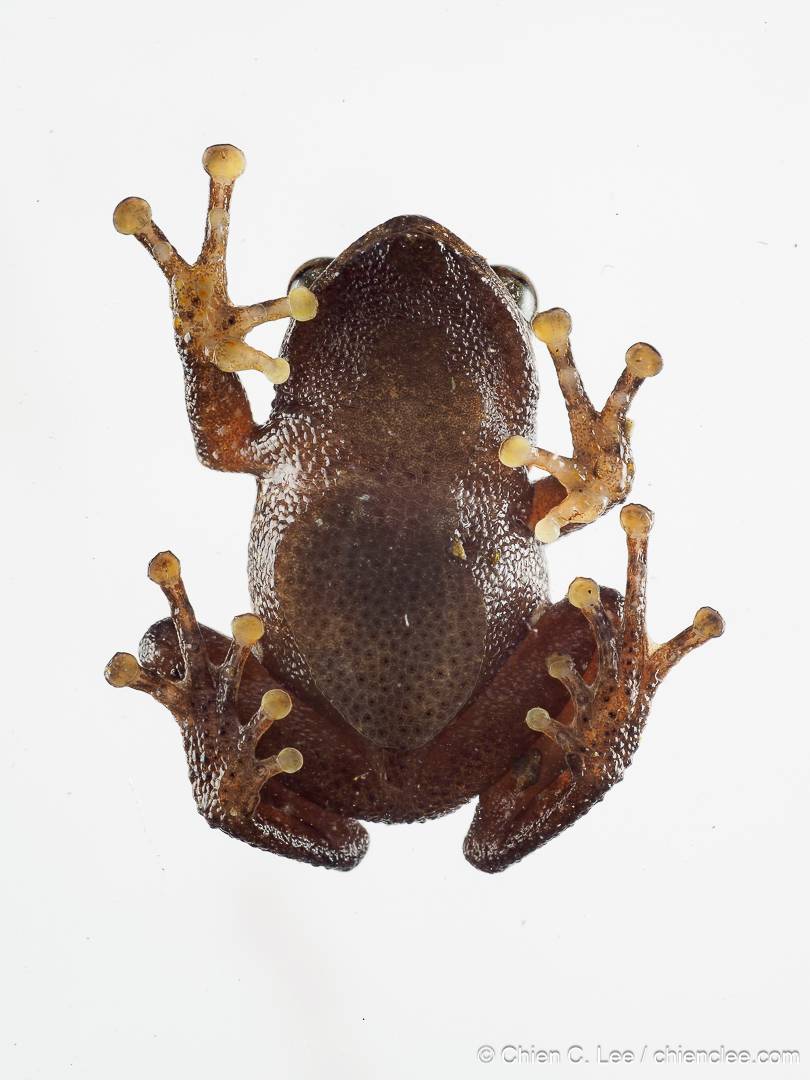 This species has rarely been documented with certainty. Consequently, the following description relies primarily on the holotype. Males reach 22 mm in snout–vent length (female unknown). The forehead is concave in profile. The canthus rostralis is indistinct. The eardrum is visible but indistinct. A distinct, strongly curved supratympanic fold extends from the eye to the armpit. When the hindlimb is adpressed forward along the body, the heel reaches the level of the snout tip. All digits bear transversely oval adhesive discs. The dorsal skin is relatively smooth. A small conical tubercle is present at the heel. The pupil is horizontal and oval.
