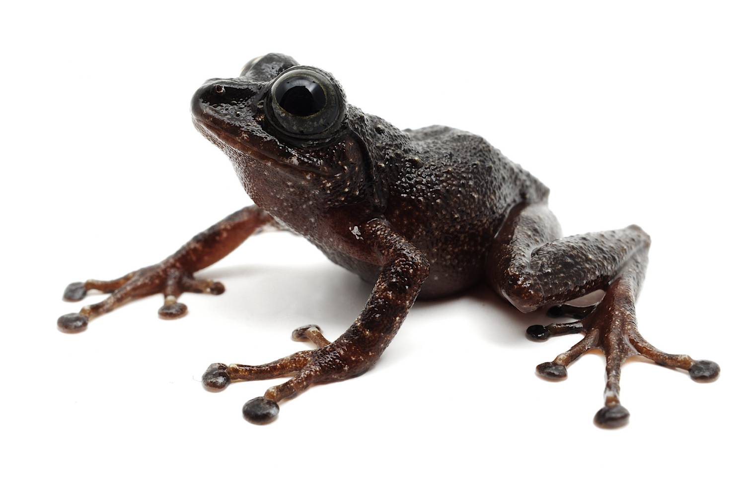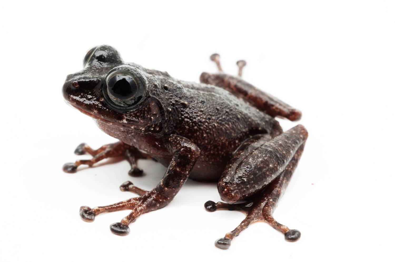 At daytime these frogs are almost uniformly blackish above, but lighten up to light grey during the night. Size, coloration, and body proportions make this frog unique. Note long digits and broad adhesive discs. The snout is rounded from above and in profile. The eyes are big and bulging. The dorsal skin texture is granular without conspicuous projecting tubercles. Tubercles are also absent at the heels.