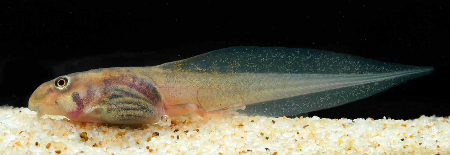We have found tadpoles of R. pardalis in a variety of lowland forest habitats. The species uses standing water such as ponds, intermittent stream sections, or isolated stream-side pools. The size of breeding sites ranges widely, from small pig wallows only a few square meters in area to large ponds covering several hundred square meters. Tadpoles forage mainly along the bottom and grow to more than 48 mm total length. The tail is pointed. Tadpoles of some populations exhibit strikingly contrasted coloration, often with a pale patch and dark marking below the eye and dark pigment between the eyes (similar to H. raniceps but lacking glandular patches). Other populations show only pale markings on the cheeks.