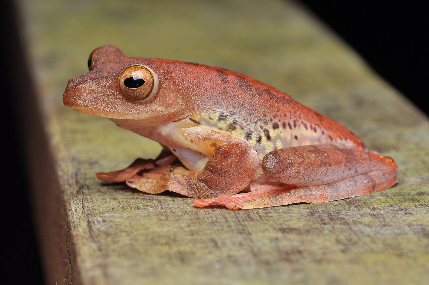 Rhacophorus pardalis is the “flying frog” most likely to be encountered by naturalists in primary and old secondary forests throughout much of Borneo. Of course, it is a glider rather than a true flier. Its moderately large size, bright red hand and foot webbing, and yellow flanks patterned with black dots make this species easy to identify. Beyond Borneo, its range includes Peninsular Thailand, Peninsular Malaysia, Sumatra, and the Philippines.