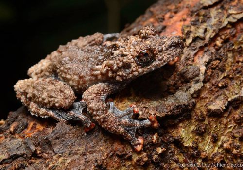 Frogs of this genus have a wide distribution in Asia. More than 20 species have been described by science (ASW), but only two have been positively confirmed for Borneo. These frogs have excellent camouflage and probably spend most of the time high up in trees, breeding in treeholes, so that they are less frequently seen than other tree frogs that uses ponds or stream for reproduction.