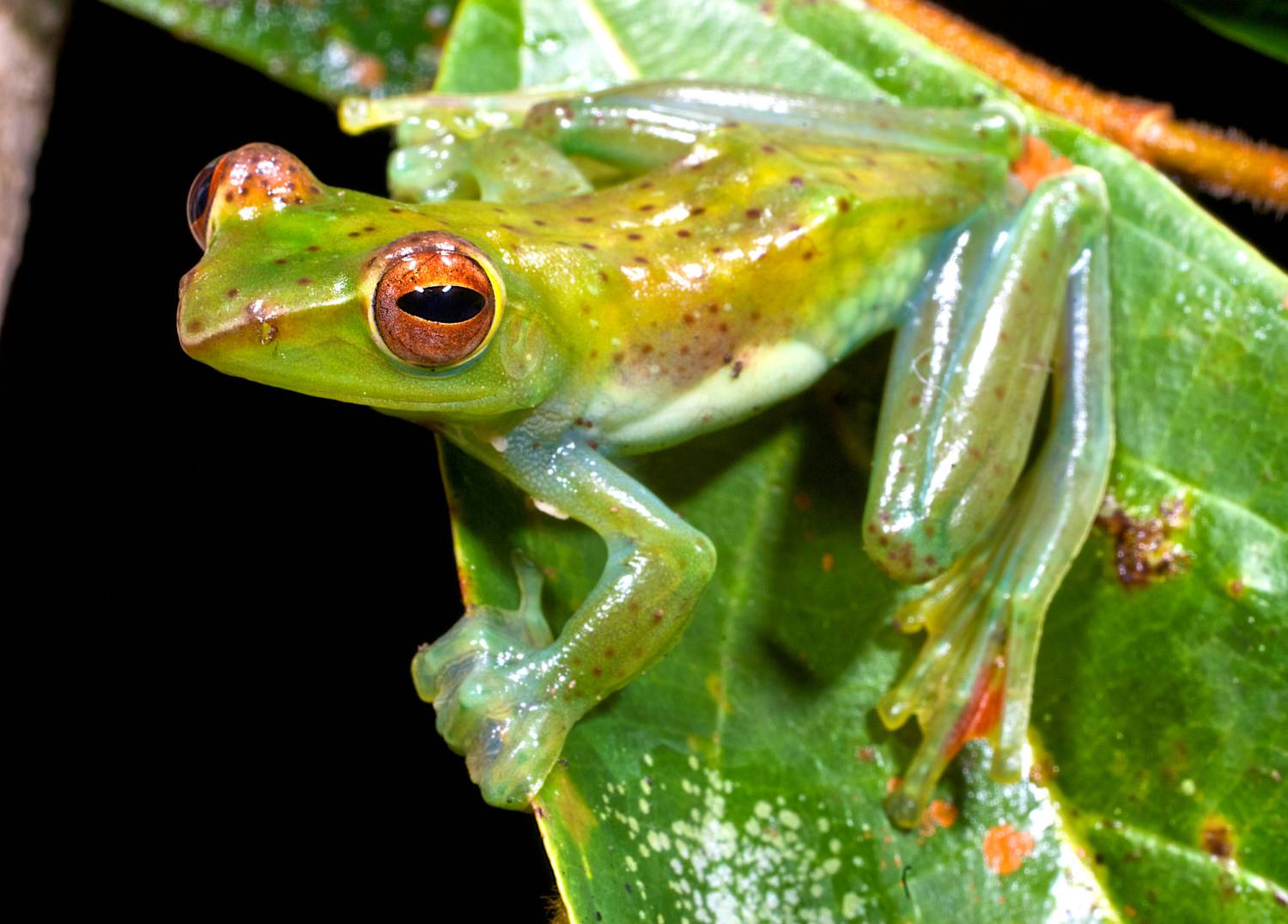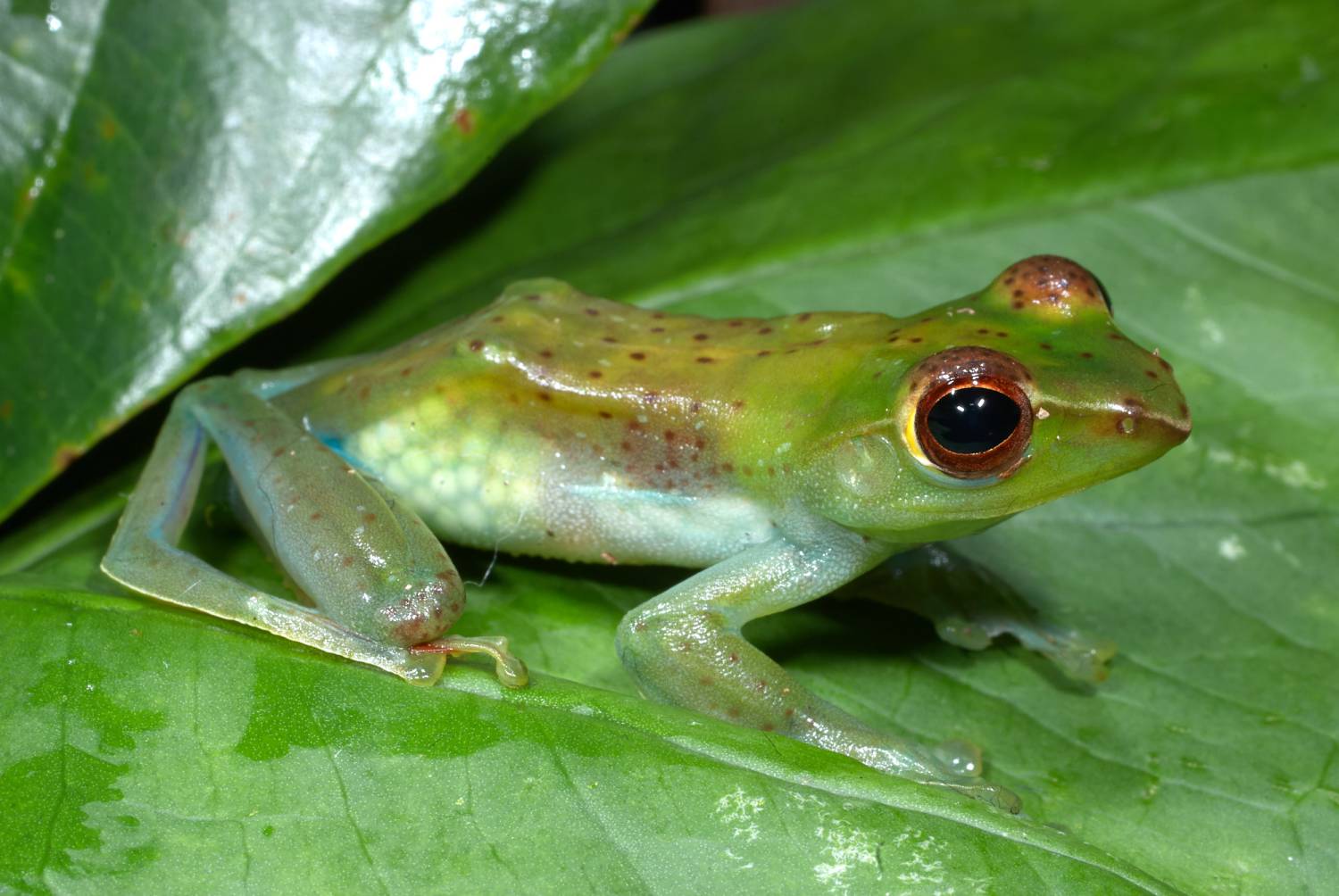 Zhangixalus dulitensis is among the most beautiful and graceful Bornean frogs. The coloration is a luminous green with some red-brown markings. The belly skin is partially translucent, so that eggs can be seen in females.